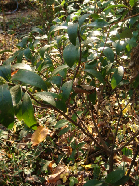 葉は互い違いについており、表面は光沢があります。